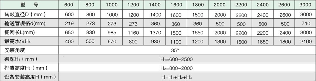 設(shè)備與水平面成35度安裝在水渠中,污水從格柵開(kāi)式端口流經(jīng)柵條進(jìn)入渠道中,柵條將固體污物截留,到一定的水位差時(shí),定位在中心軸上的旋轉(zhuǎn)耙在柵鼓內(nèi)旋轉(zhuǎn),旋轉(zhuǎn)耙耙齒插入格柵條內(nèi)將格柵條清潔,并帶動(dòng)向上運(yùn)轉(zhuǎn)。當(dāng)運(yùn)行至高點(diǎn)時(shí),所有柵渣落入中央柵渣螺旋槽內(nèi),并通過(guò)中央柵渣螺旋槽內(nèi)螺旋輸送壓榨機(jī)擠干、脫水,并運(yùn)至上端排料斗排出。